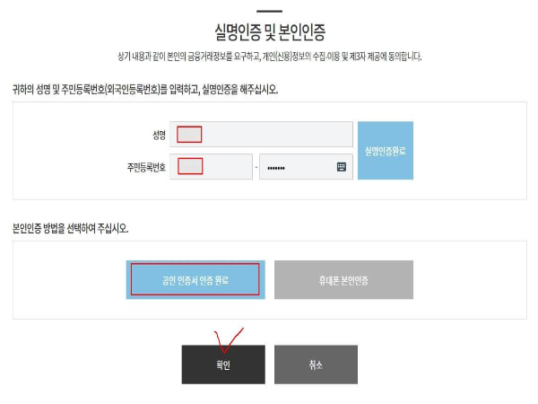 공인인증서를 이용하여 본인인증을 합니다.