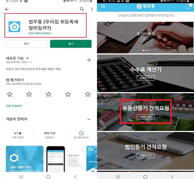 이 앱에서는 붉은 색 박스안의 부동산등기 견적요청 메뉴만 쓰게 될 것입니다.
