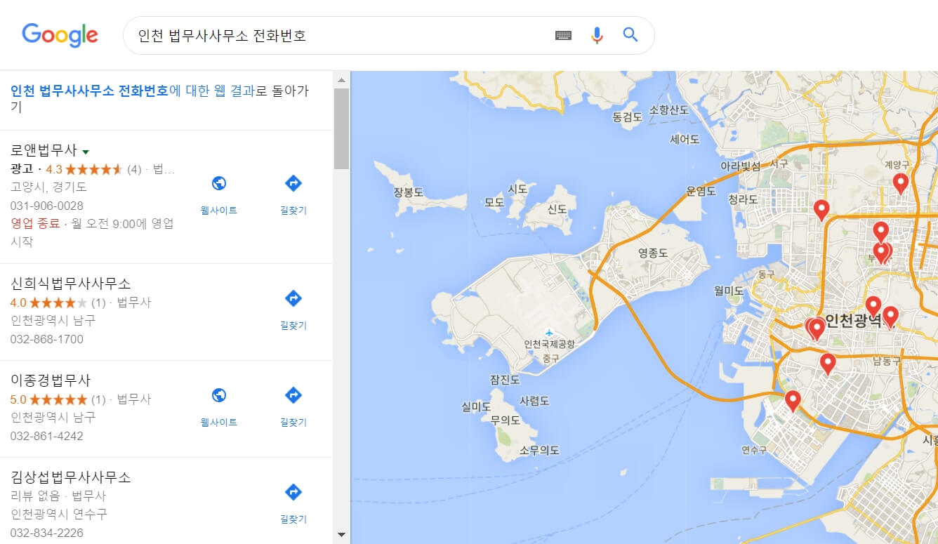 구글에서 '인천법무사사무실'로 검색해서 나오는 연락처 중