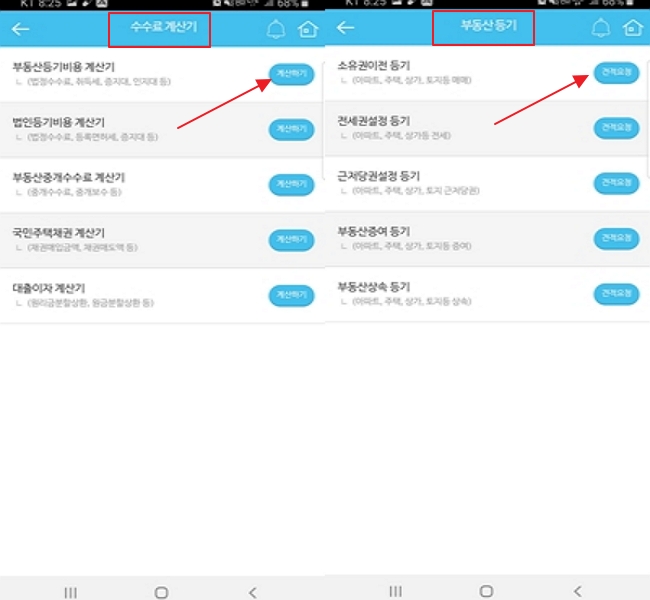 메인메뉴의 '수수료계산기'를 누르면 다음과 같이 부동산등기비용 계산기,