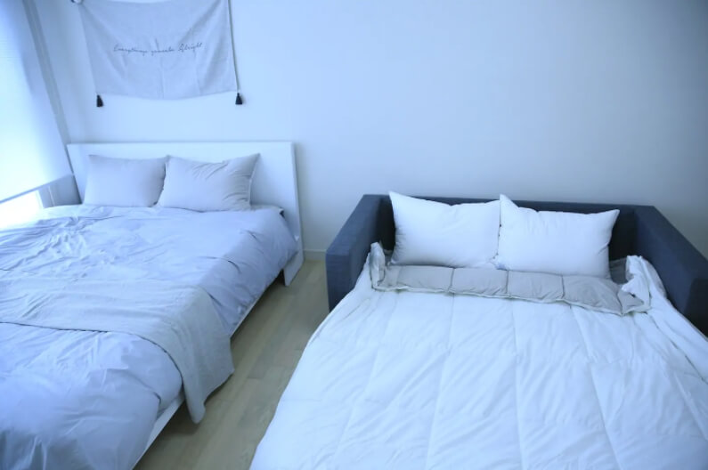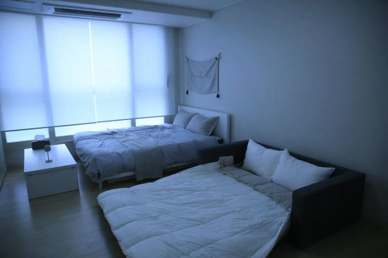 접이식 소파는 잘 때는 침대로 바꿔서 이용할 수 있는 숙소로