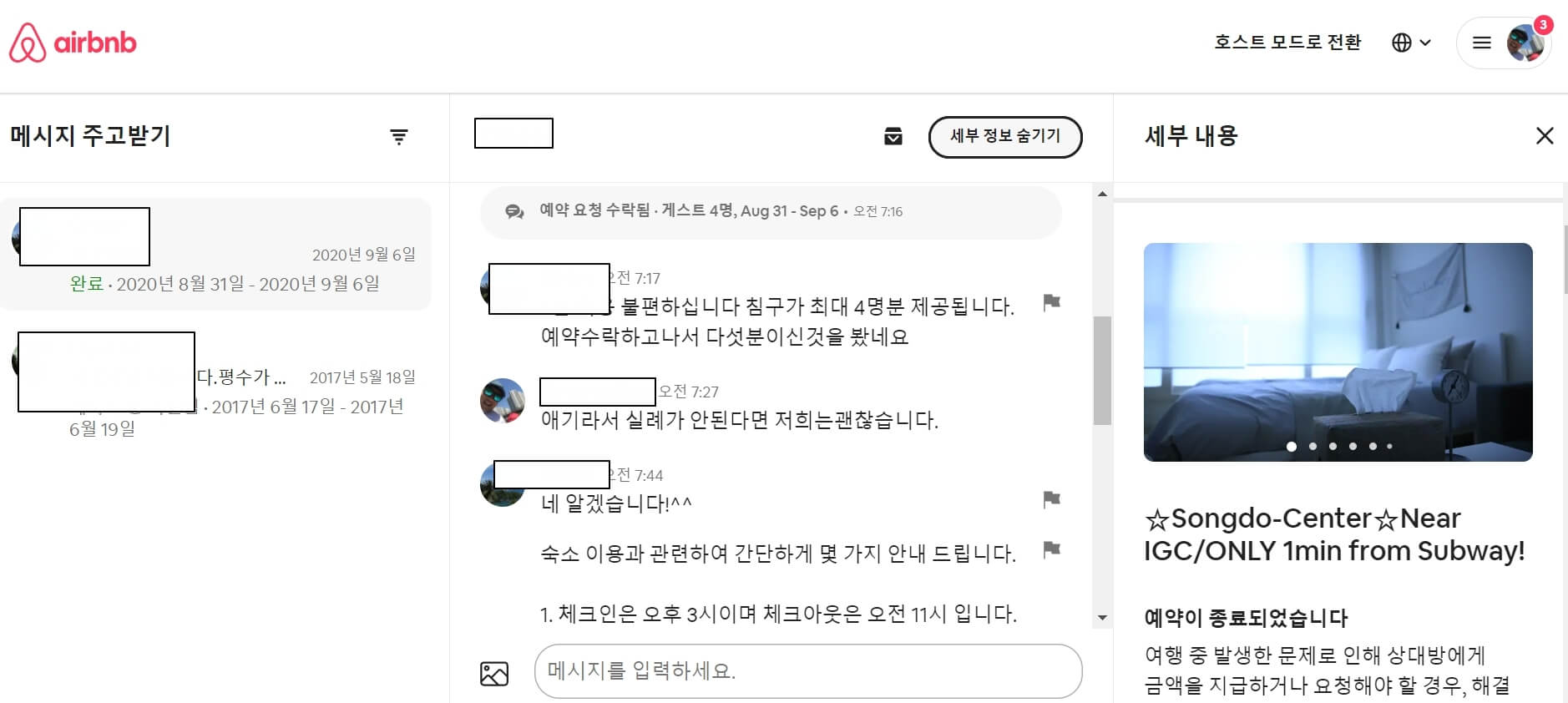 숙소를 예약하고 호스트와 채팅을 주고받습니다.