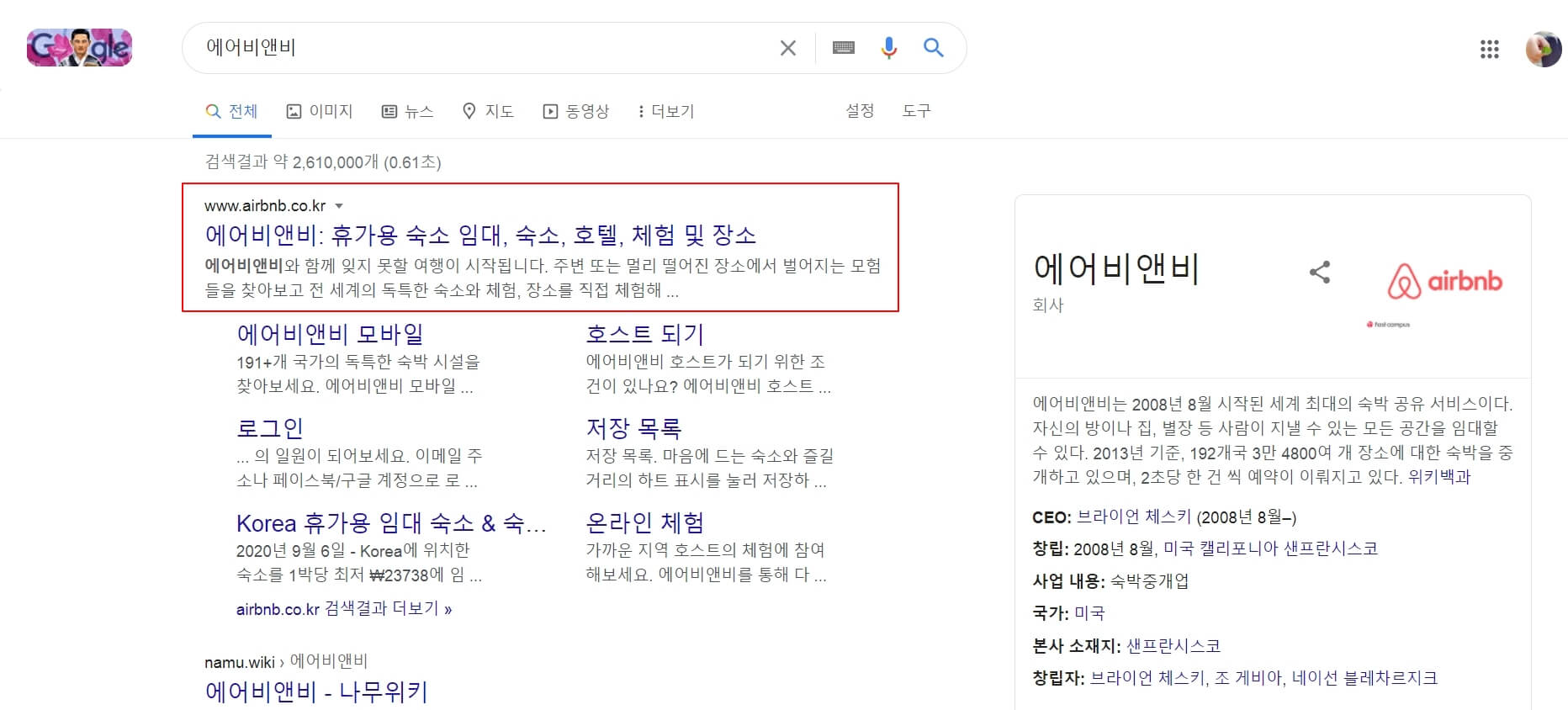 검색 엔진에서 '에어비앤비'를 검색합니다.